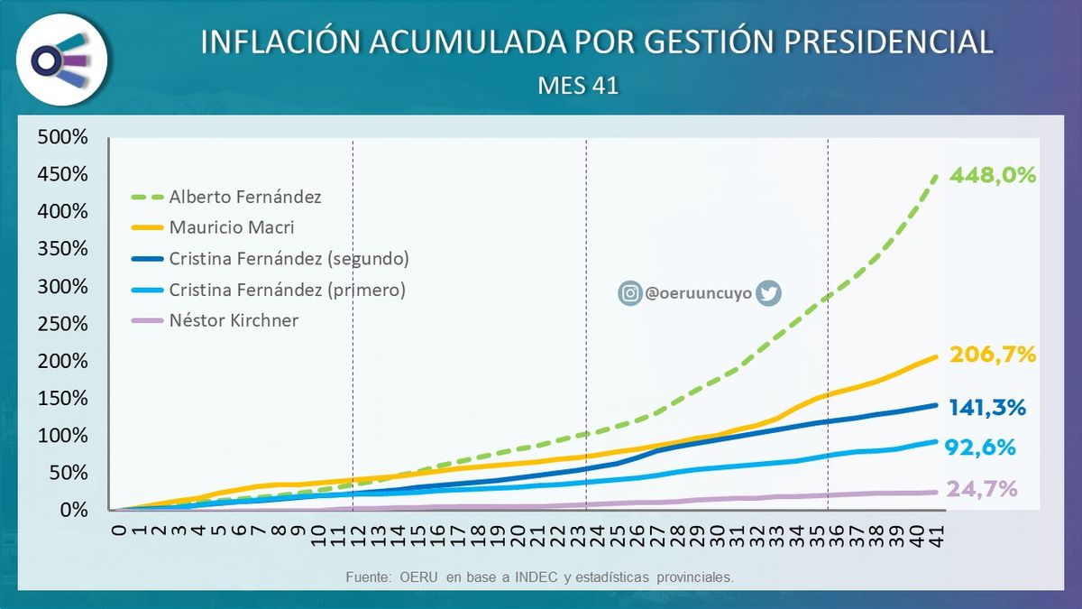 En realidad, en ese período de gobierno la inflación ya había escalado al 141,3% en los primeros 41 meses, superando a su propio mandato anterior que arrojó 92,6 por ciento en el mismo lapso y al de Néstor que arrojó el 24,7 por ciento. Según el reciente estudio del Observatorio Económico Regional y Urbano (UNCuyo), en base al INDEC y estadísticas provinciales, la inflación del gobierno de Macri aumentó al 206,7 por ciento en 41 meses, mientras que la gestión de Fernández ya lleva 448%to de inflación acumulada.