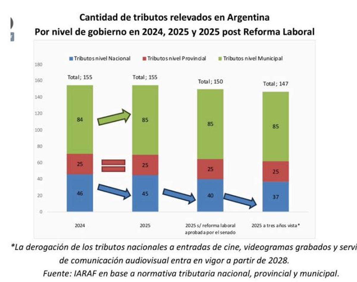 El gráfico muestra los impuestos nacionales, provinciales y municipales desde diciembre de 2023 a la fecha, incluido lo que está en la reforma laboral recién aprobada por la Cámara de Senadores si la aprobara Diputados.
