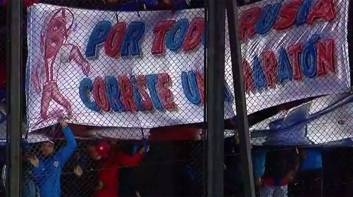 En el partido de este lunes entre San Lorenzo y Racing de Córdoba, el comienzo del segundo tiempo estuvo demorado por una bandera que había colgado la gente del Ciclón y que aludía a su eterno rival, Huracán.