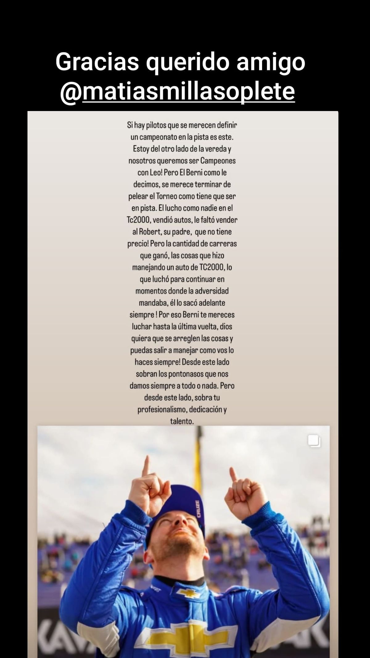 El piloto de San Martín, de 34 años, compartió un emotivo mensaje de apoyo de su colega y amigo Matías Milla en el que, entre otras cosas, indicó: "Si hay pilotos que se merecen definir un campeonato en la pista es este. Berni, te merecés luchar hasta la última vuelta. Dios quiera que se arreglen las cosas y puedas salir a manejar como vos lo hacés siempre".
