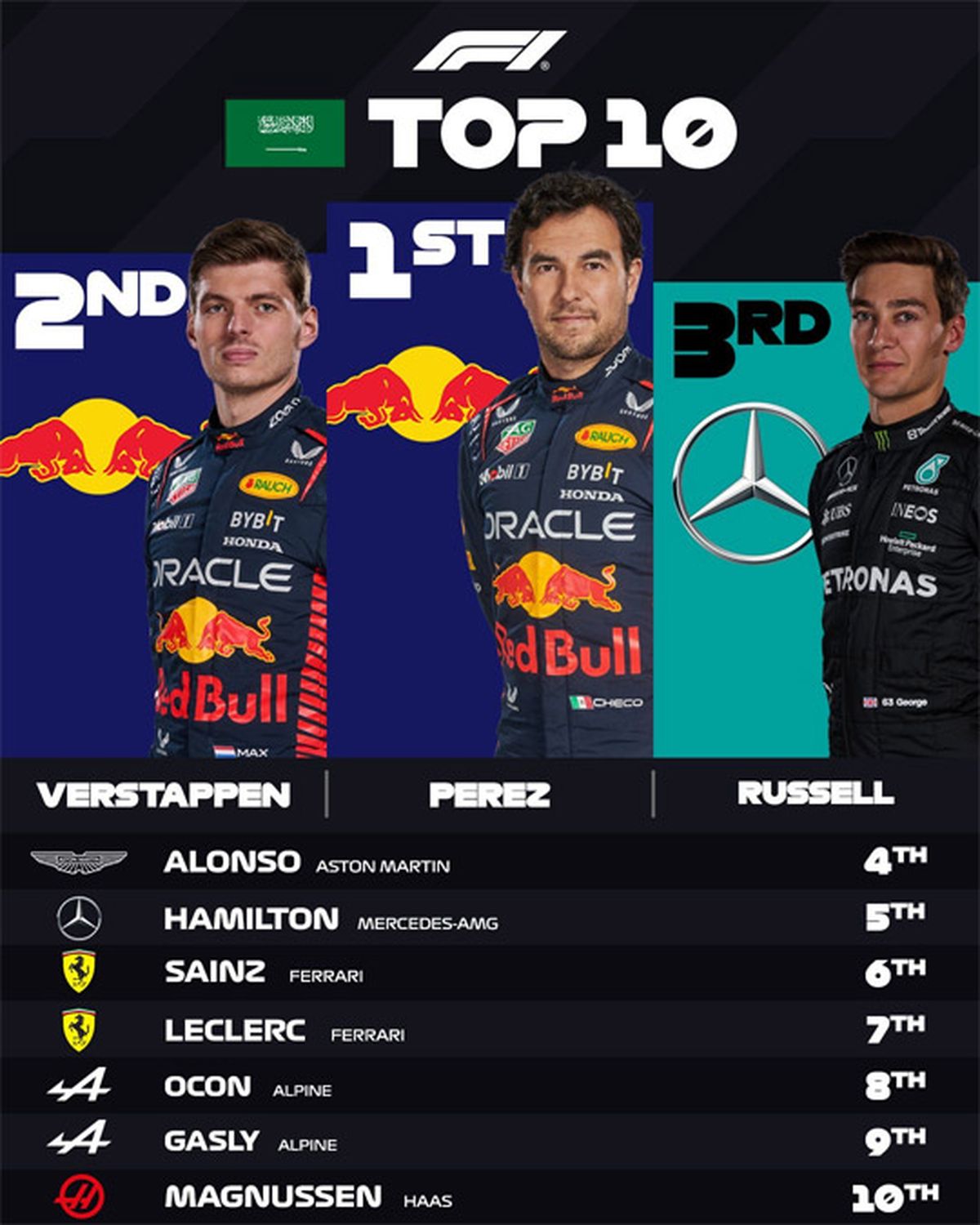 El mexicano Sergio Checo Pérez (Red Bull) ganó abrumadoramente el GP de Arabia Saudita de la F1, segunda competencia del calendario anual de la categoría que se llevó a cabo en el circuito callejero de la ciudad de Jeddah.