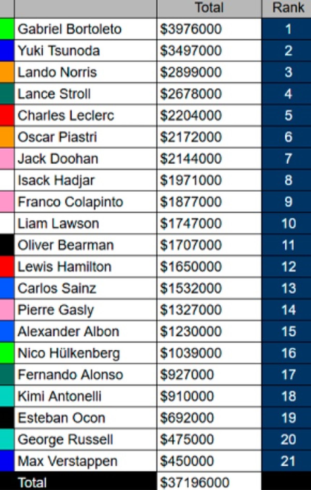 En segundo lugar entre las escuderías quedó McLaren (Lando Norris y Oscar Piastri) con 5.071.000 dólares y el podio lo completó Sauber Motorsport (Gabriel Bortoleto y Nico Hülkenberg) con 5.015.000 dólares.