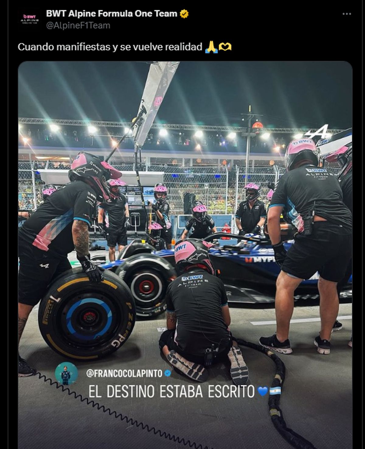 "VAMOS FRANCO. Se incorpora a nosotros con un contrato de varios años. Franco será nuestro piloto de reserva para 2025", anunció el equipo Alpine que ya sortea entre sus fans una remera firmada por el joven nacido en Pilar.
