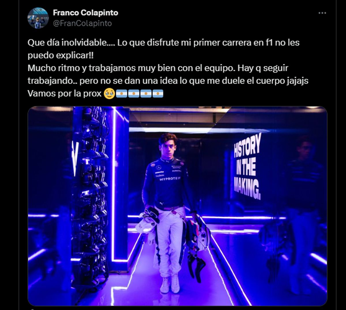 "Que día inolvidable. Lo que disfrute mi primer carrera en F1 no les puedo explicar!! Mucho ritmo y trabajamos muy bien con el equipo. Hay que seguir trabajando, pero no se dan una idea lo que me duele el cuerpo jaja. Vamos por la proxima" (Franco Colapinto en X)