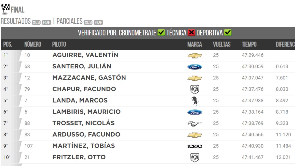 Julián Santero, de Ford, y Gastón Mazzacane, de Chevrolet, completaron el podio, seguidos por Facundo Chapur (Dodge) y Marcos Landa (Torino).