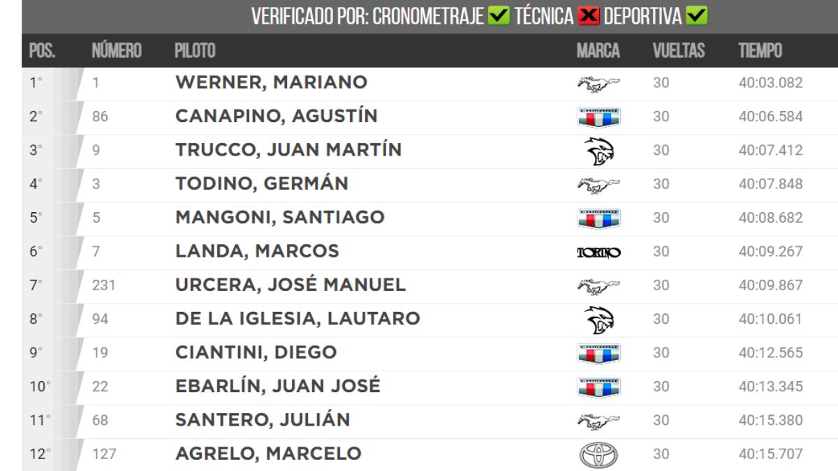 La segunda posición quedó en manos de Agustín Canapino, que largó sexto y tuvo una muy buena remontada. Incluso se acercó a Werner a falta de 10 vueltas, pero no pudo seguirle el ritmo: “Mariano (Werner) está en otra categoría”, reconoció tras la carrera.