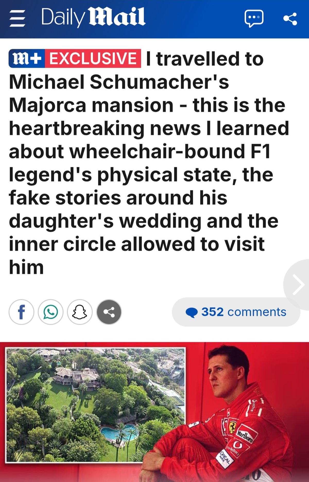 Según la publicación Schumacher no puede caminar, pero no está postrado en una cama sino que puede trasladarse en una silla de ruedas dentro de su casa, con asistencia permanente, y hasta vio algunas carreras de Fórmula 1 junto a Jean Todt, ex director del equipo Ferrari, y una de las pocas personas que lo ha visitado habitualmente en los últimos 12 años.
