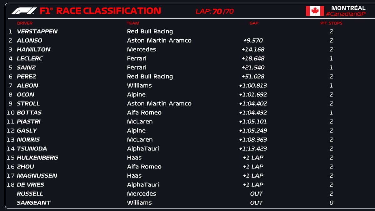 Fernando Alonso terminó segundo con Aston Martin en el Circuito Gilles Villeneuve de Montreal, el sexto podio del español en ocho carreras, y el británico Lewis Hamilton, siete veces campeón del mundo, fue tercero con Mercedes.