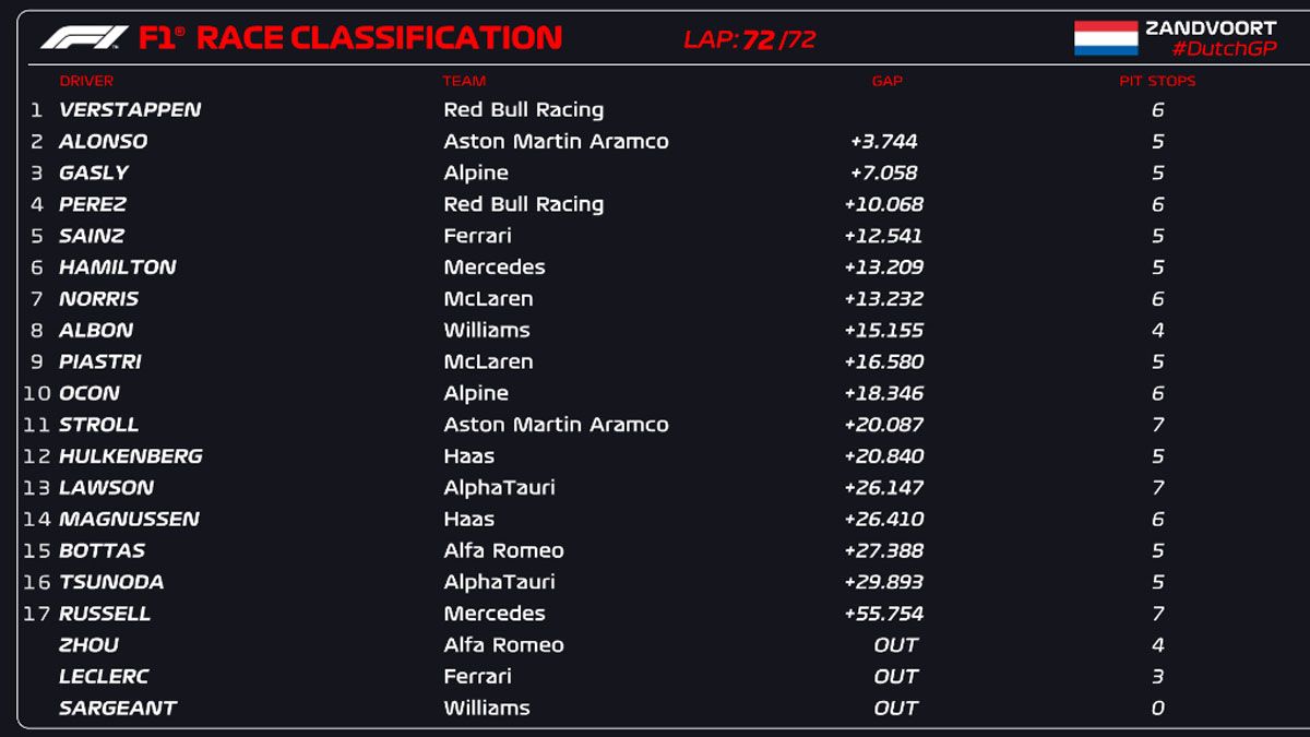 Aclamado por su público, el bicampeón titular y líder de la temporada se impuso por delante del español Fernando Alonso (Aston Martin) y el francés Pierre Gasly (Alpine), quienes completaron el podio en el segundo y tercer lugar.