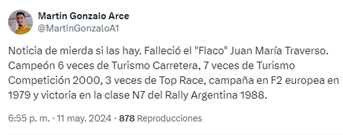 Murió Juan María Traverso, uno de los grandes del automovilismo nacional