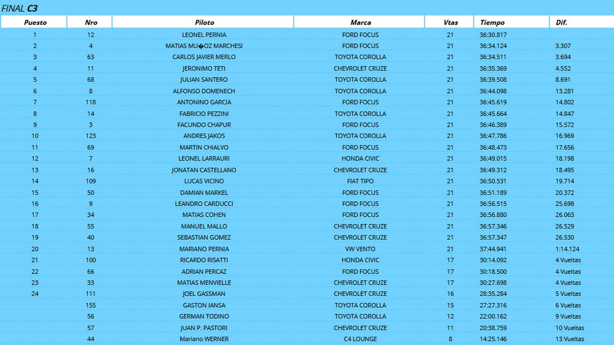 El tandilense Leonel Pernía, con Ford Focus, ganó este domingo la final de la Clase 3 del Turismo Nacional (TN), que por la segunda fecha del campeonato de la especialidad, se corrió en el circuito bonaerense de San Nicolás.