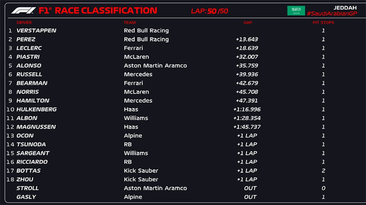 El piloto neerlandés Max Verstappen se adjudicó el GP de Arabia Saudita desde la pole position y Red Bull continuó su dominante inicio de la temporada de la F1, con un segundo doblete en igual número de carreras.