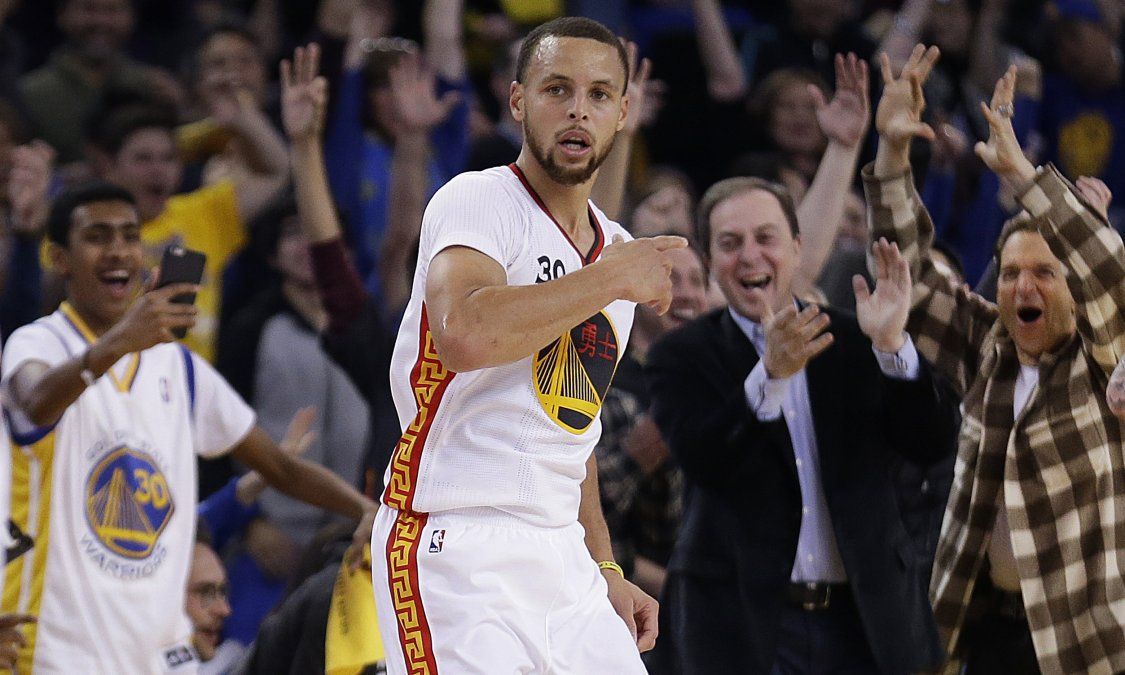 Curry se zambulló en el piso para celebrar y luego se puso a bailar junto a sus compañeros. Fue su primera canasta desde más de 12 metros (40 pies) tras meter cuatro la pasada temporada.