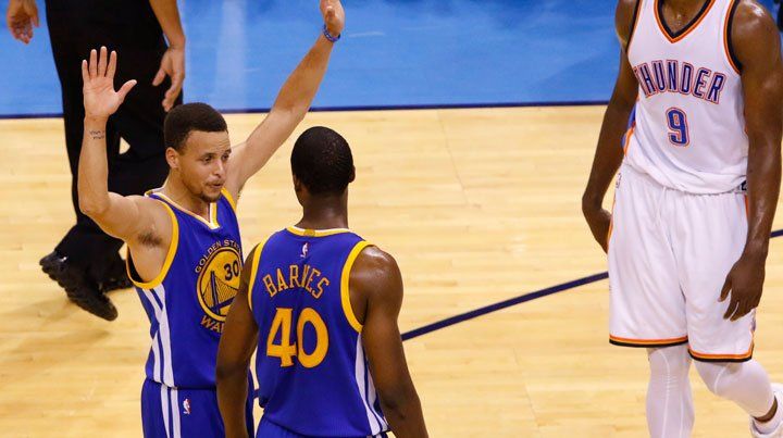 El escolta Klay Thompson, que estableció un nuevo récord con once triples en un partido de playoffs, anotó 41 puntos, mientras que el base Stephen Curry se recuperó de un discreto inicio de partido y terminó con 29 tantos, 10 rebotes y nueve asistencias.
