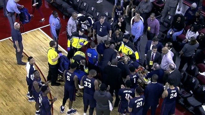 Escenas de pánico y desesperación debieron vivir los compañeros de Tyvoris Solomon, jugador de los Bulldogs de la Universidad Estatal de Carolina del Sur, en el partido de básquet frente a Wolfpack de la Universidad Estatal de Carolina del Norte.