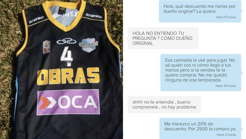 Juan Gutiérrez le quiso comprar a un vendedor una camiseta que él mismo usó y no tiene cuando jugaban en Obras Básket. La ofrece en el sitio Mercado Libre.