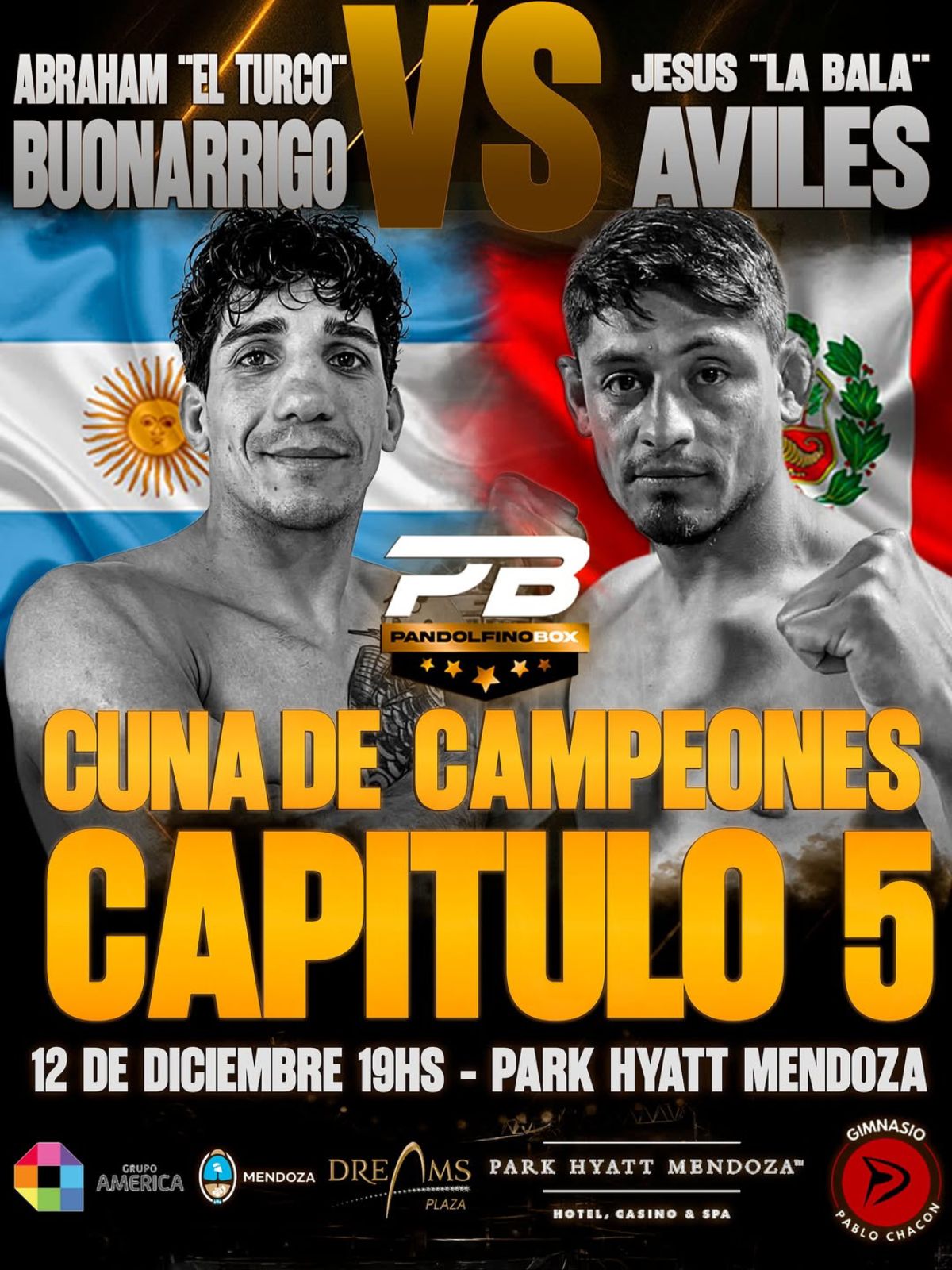 Abraham Gabriel Buonarrigo (14-5-0, 11KO), ex campeón sudamericano supermediano, se medirá a 10 rounds en una pelea internacional, con el zurdo peruano Jesús la Bala Avilés (9-9-0, 2 KO). El Turco de Guaymallén retornó al ring local el pasado 6 de septiembre, tras un breve paso por Estadios Unidos donde no pudo combatir por no conseguir los permisos pertinentes. En el Poliguay noqueó en tres rounds al tunuyanino Leonel Hinojosa.