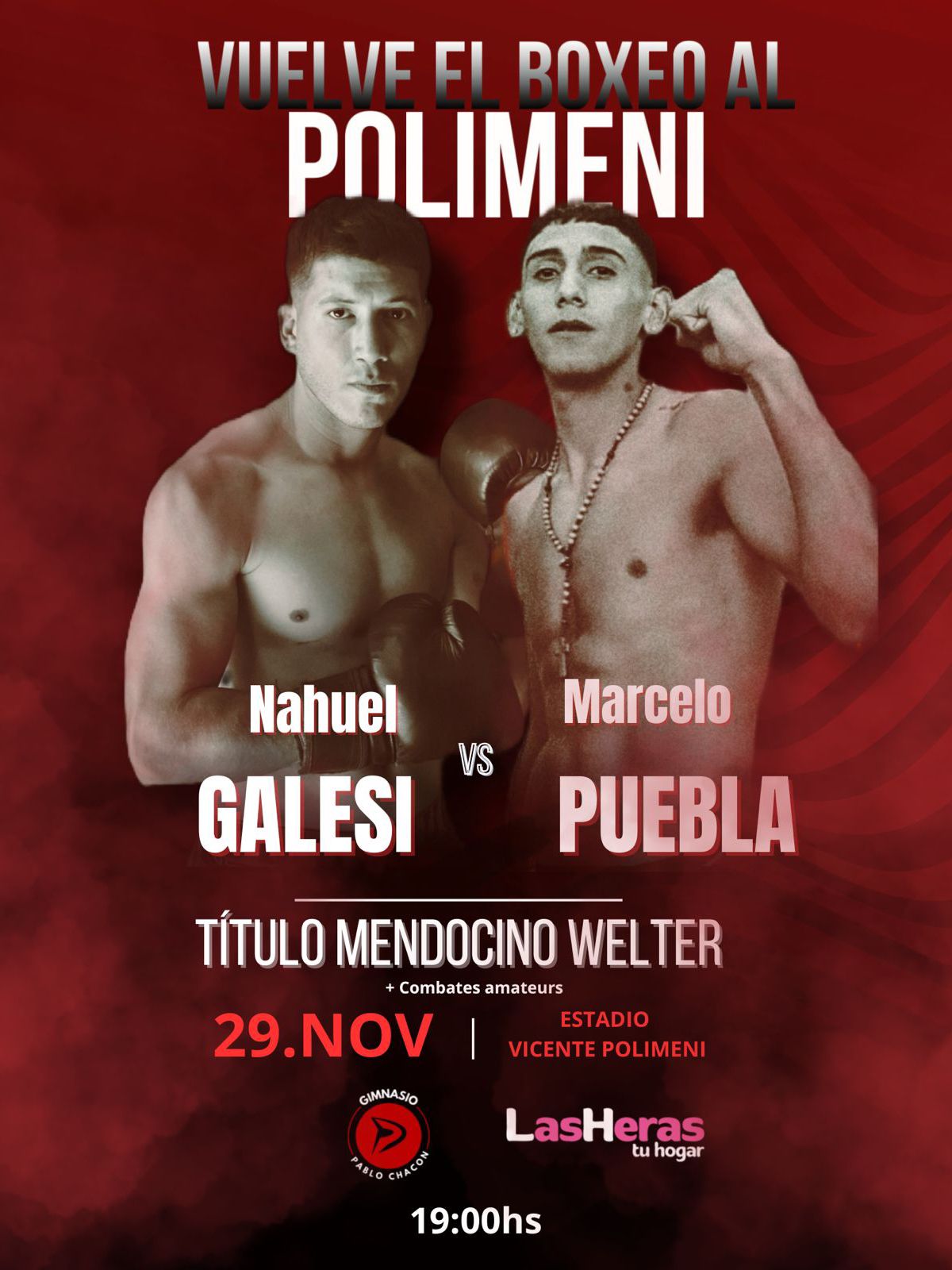Allí combatirán por el título mendocino superwelter el lasherino Nahuel el Perfecto Galesi contra el sanrafaelinio Marcelo Agustín Tagua Puebla en el combate principal de la velada.