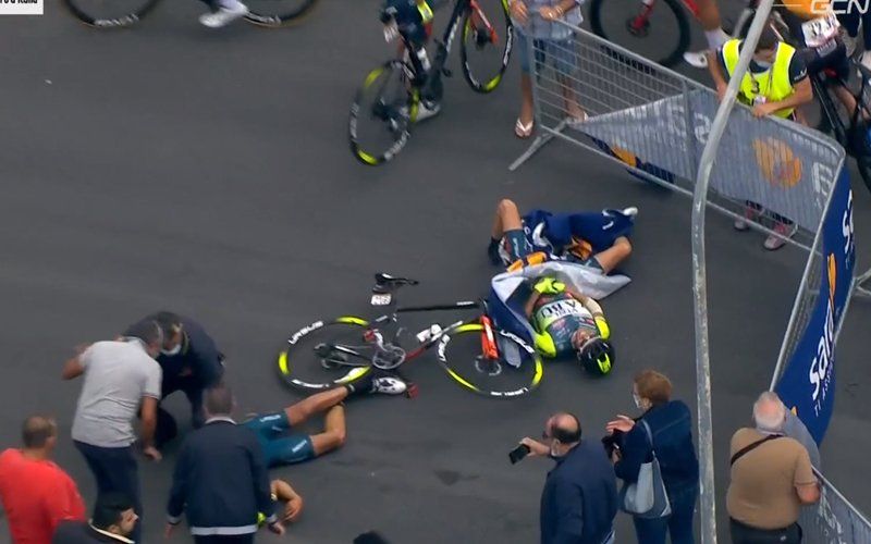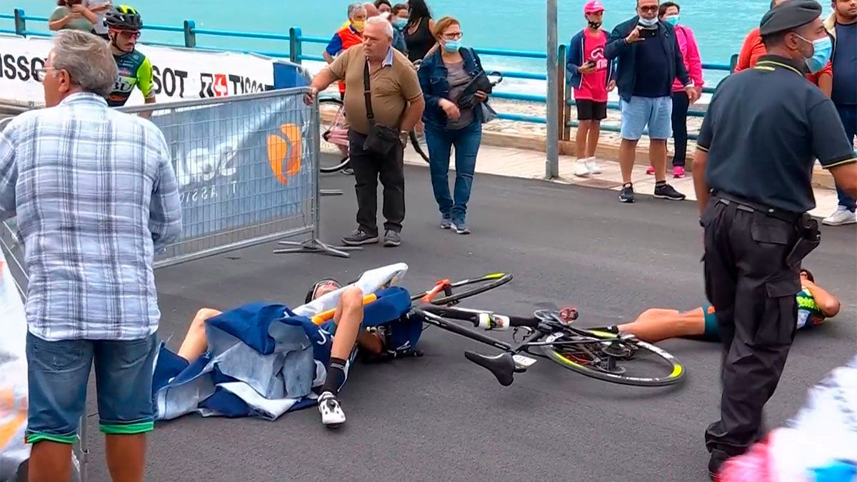 En la cuarta etapa del Giro de Italia se produjo un accidente provocado por el viento que generó un helicóptero, por lo que los ciclistas del equipo Vini Zabu, el italiano Luca Wackermann y el holandés Etienne van Empel, sufrieron una importante caída.