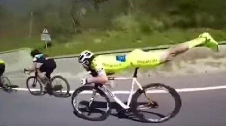 Un ciclista adoptó una particular forma de adelantar a sus oponentes cuando vio que se quedaba último del pelotón.