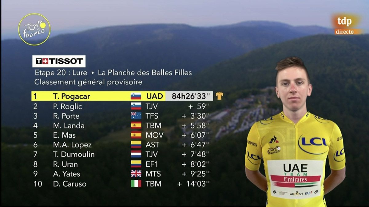 El prodigio esloveno Tadej Pogacar, de 21 años, voló en una crono muy exigente, con 6 kilómetros de subida final a la Planche de Belles Filles, con un tiempo de 55m55s, a una medida de ¡39,5 km/h!, ante un Primoz Roglic que al finalizar la etapa no podía creer lo sucedido en la penúltima etapa del Tour de Francia.