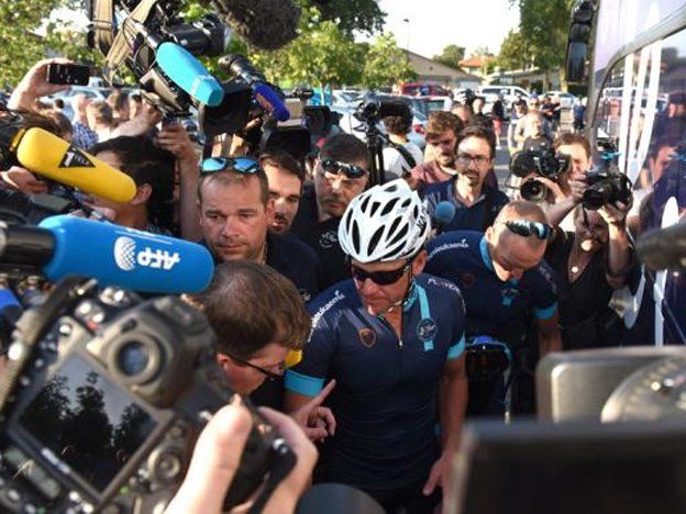 Con un casco y un maillot negro y azul con el nombre de la asociación, Armstrong se había presentado a las 05h37 GMT en Vernet (Haute Garonne), en el aparcamiento de un supermercado, en un espacio preparado para la ocasión del que salió 20 minutos más tarde.Cerca de 100 periodistas, franceses y extranjeros, le esperaban. El ciclista de Texas se unió al equipo solidario, liderado por el padre de la iniciativa, Geoff Thomas, un antiguo futbolista internacional inglés (9 partidos), que logró vencer a la enfermedad.Mozzarella y confit de pato Los doce participantes (10 hombres y 2 mujeres) iniciaron el recorrido por las carreteras de la región Midi-Pyrénées e hicieron dos paradas para combatir el sofocante calor.Tras cuatro horas de esfuerzo y guiados por miembros de la organización que ayudaban con el tráfico, los doce ciclistas pararon en el restaurante Barry, en el centro de Villefranche dAlbigeois, para reponer fuerzas.Fueron recibidos con aplausos por algunos comensales. "No fue muy bonito lo que hizo y aunque no hay que olvidar, su presencia para una obra de caridad es algo bueno", señaló Jacques Pylyp, de 53 años, presente en el restaurante cuando entró Armstrong."No todos los días nos cruzamos con una celebridad aquí", sonríe Lucas, de 26 años, sentado en la terraza, que reconoce estar "orgulloso" de haber dado la mano al estadounidense.Finalmente, instalados en una agradable sombra, los doce ciclistas degustaron el menú: Tomates con mozzarella como primero y confit de pato acompañado de judías verdes como segundo. Participó en la iniciativa durante algunos kilómetros Cyrille Bonnand, antiguo campeón de Francia de mountain bike."Es un verdadero placer haber estado con ellos y espero poderles acompañar un rato más", dijo.Froome está impresionante En un principio el objetivo de la operación solidaria era "lograr un millón de libras (1,4 millones de euros)", según la organización. Pero las expectativas se superaron el martes, cuando la asociación alcanzó los 840.000 euros, según señaló un miembro de la misma a la AFP.Antes de la calurosa acogida en el almuerzo, ningún aficionado asistió a la salida del hombre que dominó el Tour de Francia durante siete años (1999-2005) antes de que sus títulos fueran borrados en 2012 por dopaje."Es un gran placer estar aquí, para esta bonita causa", dijo Armstrong, cuyo nombre saltó a la palestra el martes después de un mensaje en Twitter en el que se podía interpretar que cuestionaba la exhibición de Chris Froome, dominador de la actual edición de la carrera."Es obvio que Froome está impresionante, tener tres minutos de ventaja sobre el segundo es impresionante. ¿Es limpio el Tour? ¿Cómo quiere usted que yo responda a esa pregunta", dijo. "Es el primer año después de mucho tiempo que sigo el Tour. En la primera semana ocurrieron muchas cosas, con numerosas caídas", dijo, esquivando las polémicas.