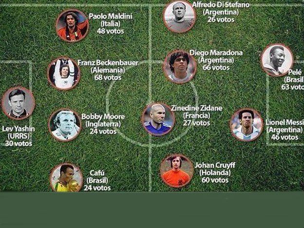 El ruso Lev Yashin, es el arquero de este "equipo ideal"; la defensa la componen Cafú, el inglés Bobby Moore, el alemán Franz Beckenbauer y el italiano Paolo Maldini.