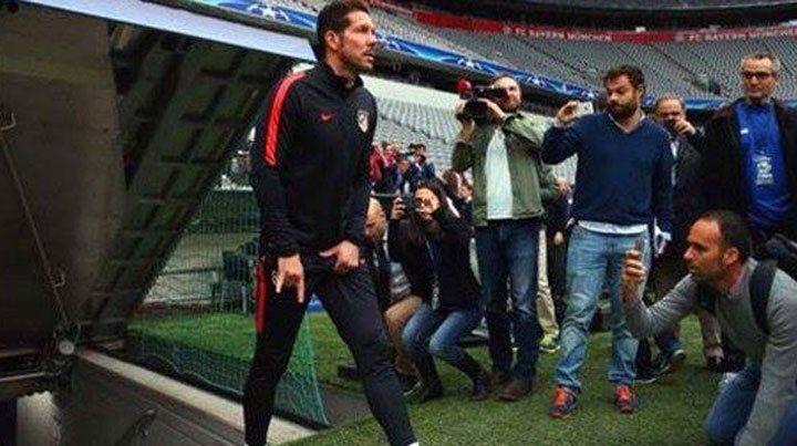 En las horas previas, cuando el Colchonero debía realizar el reconocimiento de campo en el Allianz Arena, Diego Simeone realizó los gestos de cuernitos con la mano derecha y se tocó los genitales con la izquierda.