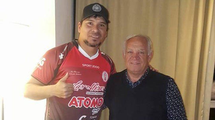 Tito Ramírez tras ponerse de acuerdo con los popes lasherinos el delantero proveniene de Guillermo Brown de Puerto Madryn posó para la foto con el presidente Rafael Giardini.