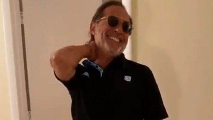 Apareció de bermudas y con una chomba de Racing y así recreó una escena de Extermineitors 3.