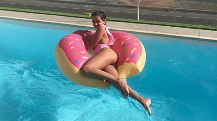 Lo curioso de la imagen, es que Mica sale abrazada "tipo koala" al futbolista con una micro bikini que le queda pintada.