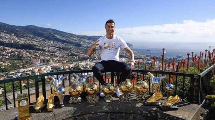 Ronaldo exhibió sus trofeos en Madeira, su lugar de nacimiento, donde tiene su propio museo. El goleador se tomó la foto mientras estaba sentado en una baranda y con la ciudad de fondo.