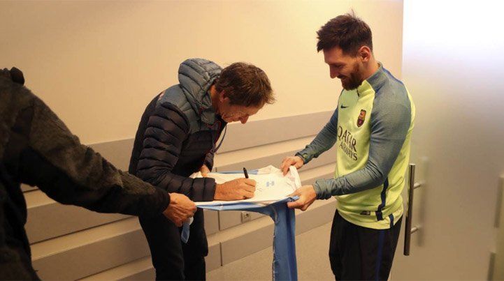 El regatista y medallista de oro en Río 2016 Santiago Lange presenció la actividad del conjunto culé, intercambió remeras con la Pulga y el Jefecito y hasta les firmó un autógrafo.