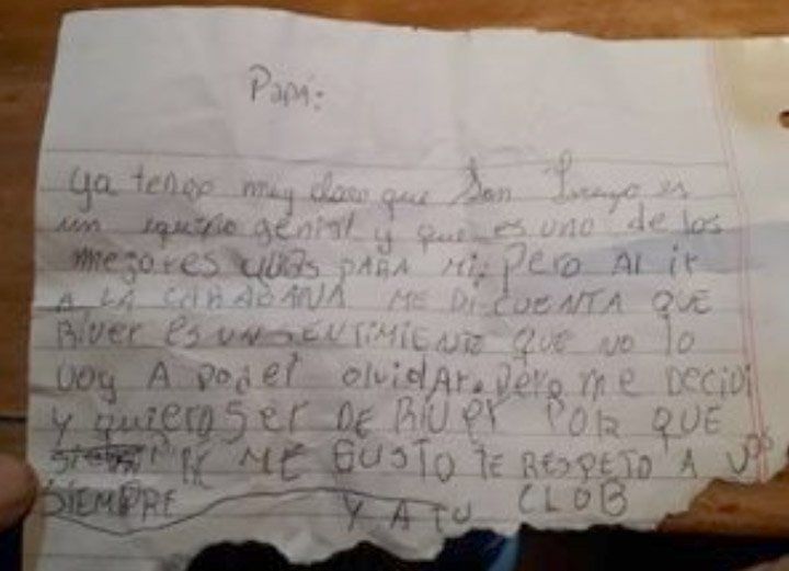 Ya de regreso a su casa, el nene que estaba en el auto con su mamá, aprovechó el tiempo del viaje de regreso para escribirle una carta a su papá. "Papá: ya tengo muy claro que San Lorenzo es un equipo genial y que es uno de los mejores clubs para mí, pero al ir a la caravana, me dí cuenta que River es un sentimiento que no voy a poder olvidar. Pero me decidí y quiero ser de River porque siempre me re-gustó. Te respeto a vos y a tu club". Valentín le pidió a su mamá que le de la carta a su papá, ya que el tenía miedo de como podía reaccionar.