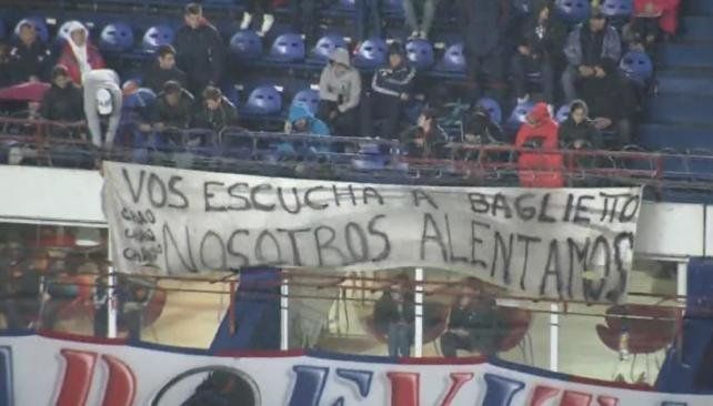 Como respuesta, los hinchas, decepcionados por su accionar, colgaron una bandera en su contra que decía: "Vos escuchá a Baglietto, nosotros alentamos".