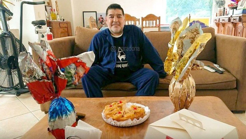 Maradona aparece en una foto rodeado de huevos de Pascuas y algunas tortas tradicionales para la fecha, mientras cumple con la cuarentena obligatoria en su domicilio como consecuencia de la pandemia de coronavirus.
