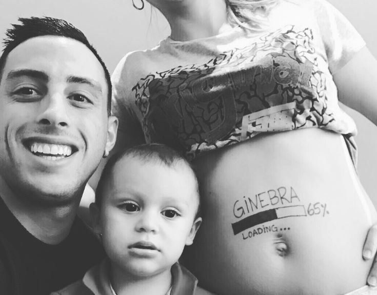 El detalle que no se puede dejar pasar es que en la panza de ella figura la inscripción "Ginebra loading 65 %", en alusión a la pequeña que viene en camino.