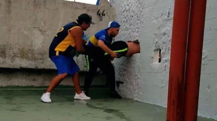 Las imágenes se dieron a conocer en las redes sociales y muestran como este individuo intentó meterse por un agujero que tiene una de las paredes del estadio para meterse en la platea, pero su cuerpo quedó atascado en el mismo.