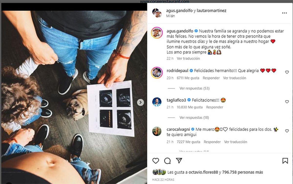 “Nuestra familia se agranda y no podemos estar más felices. No vemos la hora de tener otra personita que ilumine nuestros días y le dé más alegría a nuestro hogar. Son más de lo que alguna vez soñé. Los amo para siempre", dijeron la influencer y el jugador del Inter de Italia.