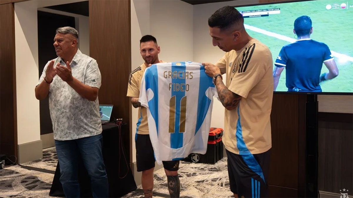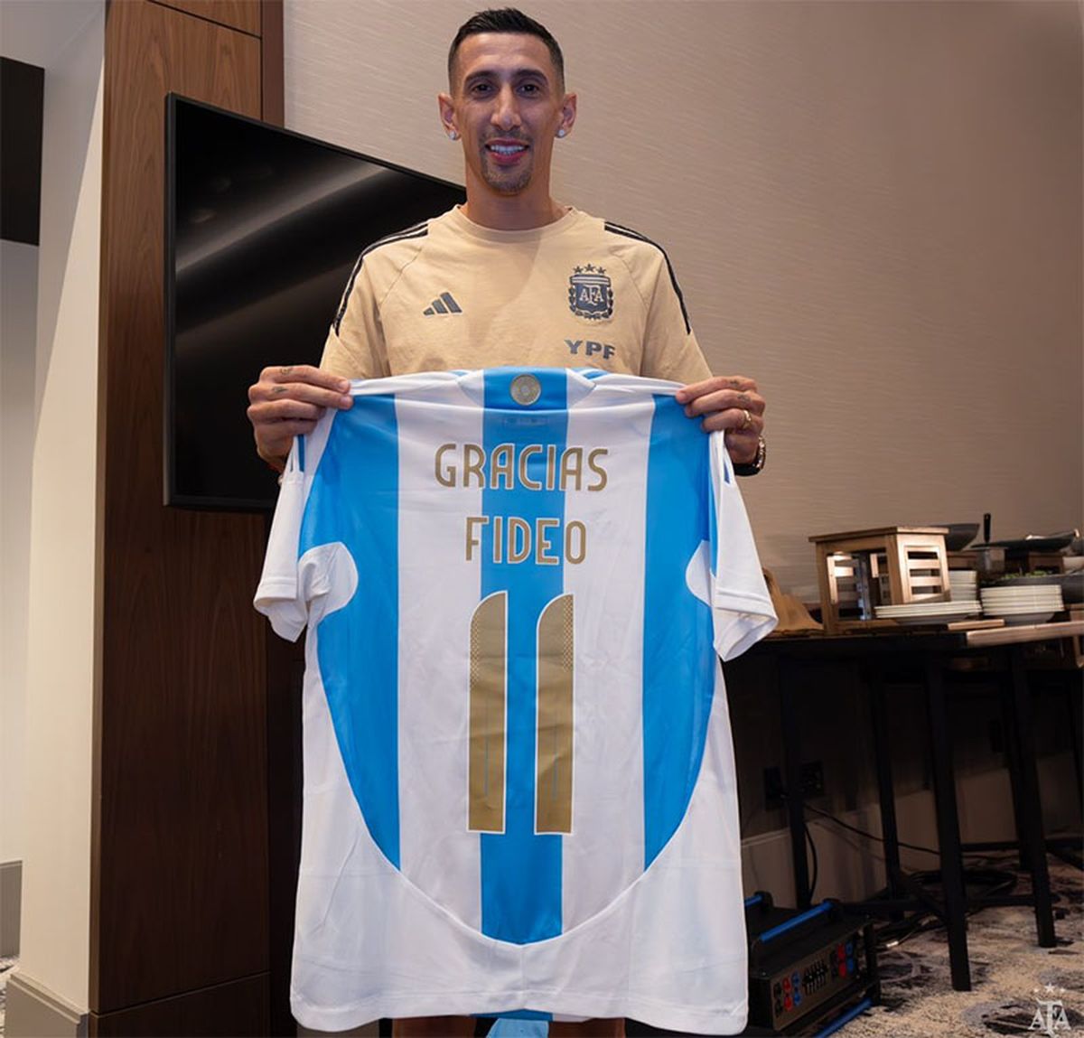 “Gracias Fideo”, dice en la espalda la camiseta argentina con un 11 dorado que le fue entrada por parte de Messi y de parte de todo el equipo argentino.