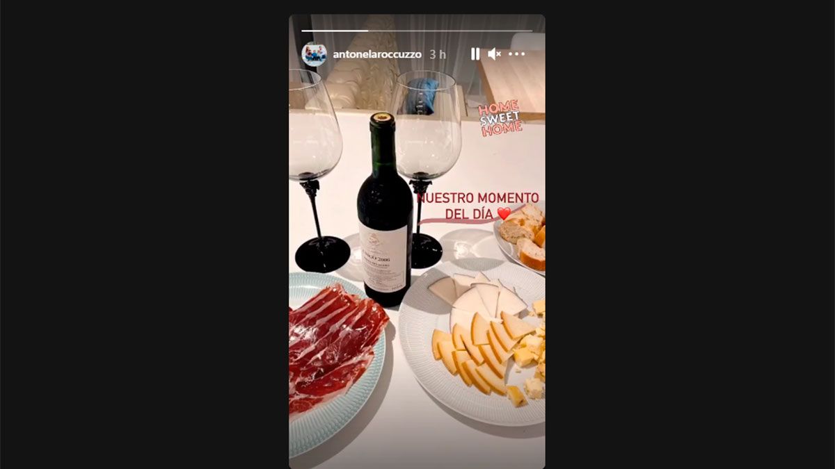 "Nuestro momento del día", escribió la mujer de Messi en una foto donde se ve una botella de vino, dos copas y para comer había jamón crudo y distintas variedades de quesos.