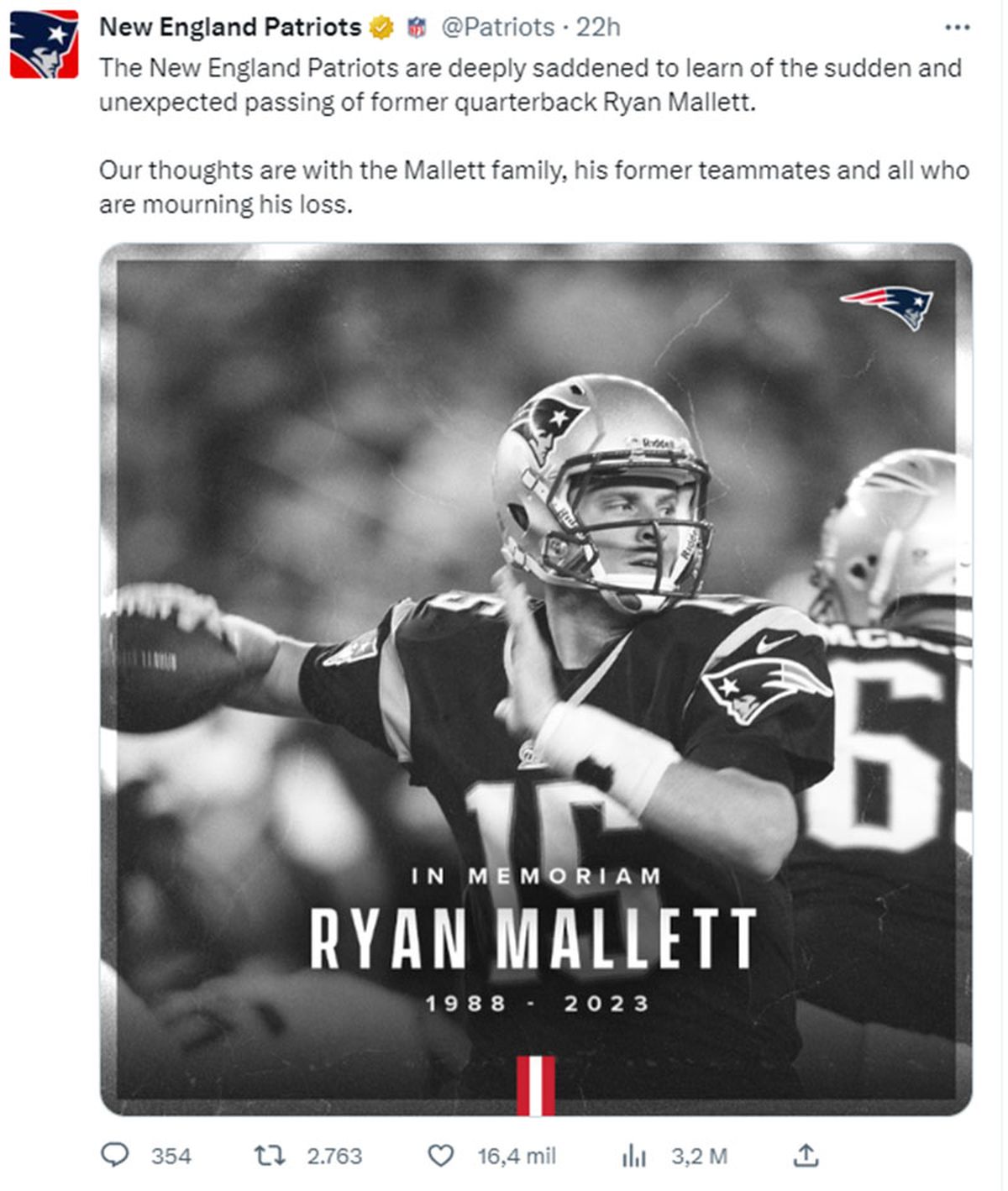 Mallett llegó a la NFL seleccionado por los Pats en la tercera ronda del Draft 2011, equipo en el que fue suplente de Tom Brady hasta la temporada 2013. “Nuestros pensamientos están con la familia Mallett, sus ex compañeros de equipo y todos los que están de luto por su pérdida”, agregó el mensaje compartido por la directiva de New England.