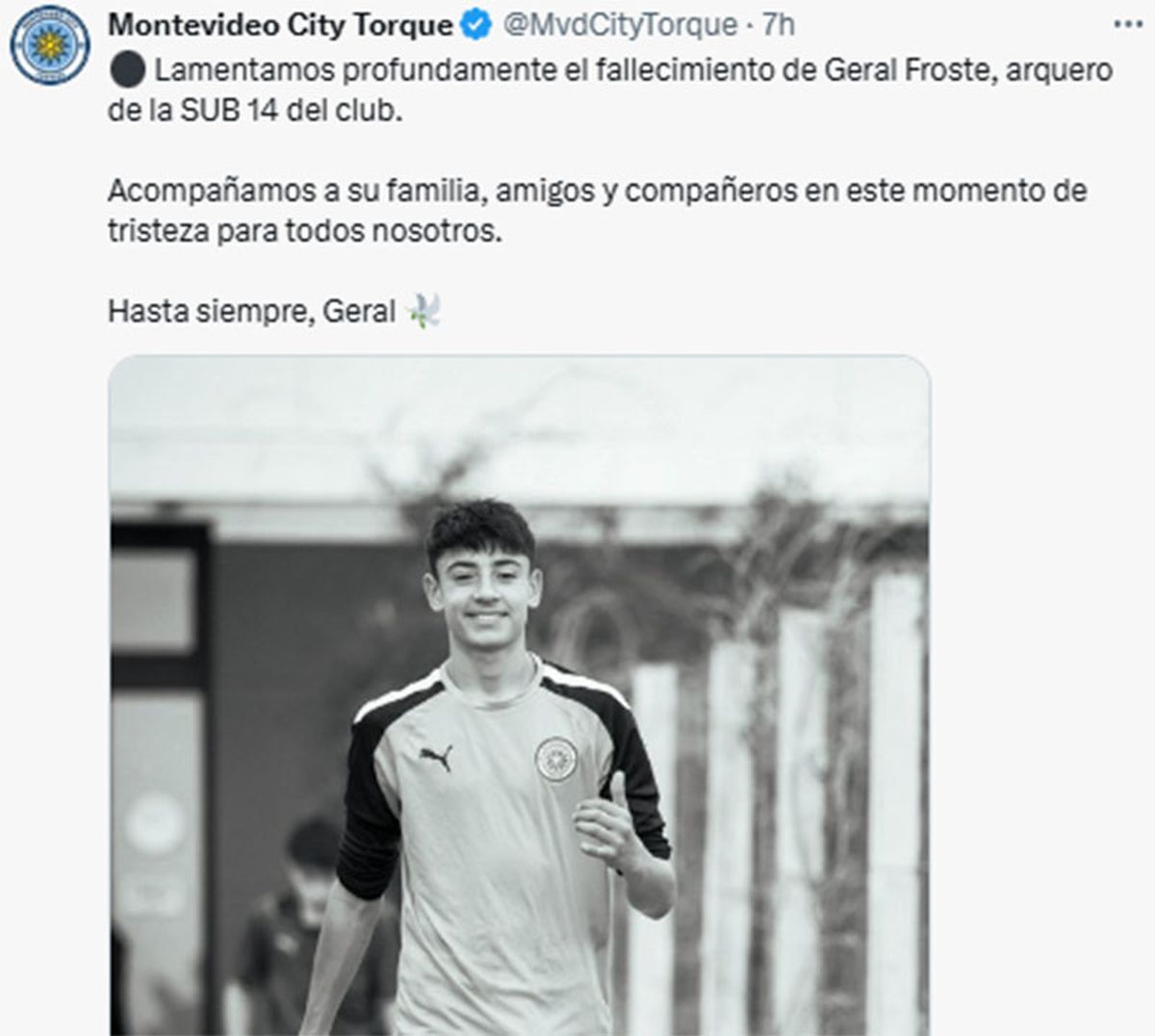 "Lamentamos profundamente el fallecimiento de Geral Froste, arquero de la SUB 14 del club. Acompañamos a su familia, amigos y compañeros en este momento de tristeza para todos nosotros. Hasta siempre, Geral", dijo el Montevideo City Torque en las redes sociales lamentándose por la muerte del niño.