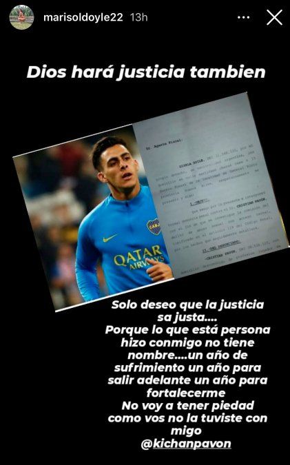 Pavón ya se presentó en la Justicia y desconoció los hechos. La noticia salió a la luz porque la misma denunciante, una mujer llamada Gisela Marisol Doyle, dio detalles del caso con una publicación su cuenta de Instagram.