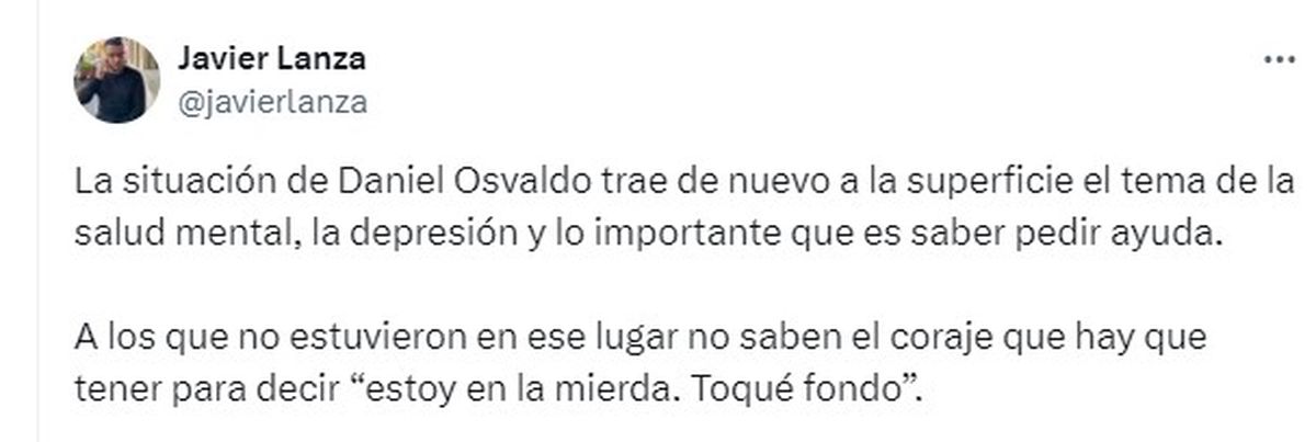 “En el pasado yo era un jugador de élite y una persona completamente diferente. Llena de seguridad y de confianza. Hoy soy una persona la cual no reconozco. Me está costando mucho salir de esto. Lo quiero decir porque por ahí alguno de ustedes está pasando por lo mismo”, reveló Daniel Osvaldo en sus redes sociales donde recibió numerosas respuestas de apoyo de futbolistas y gente del mundo artístico.
