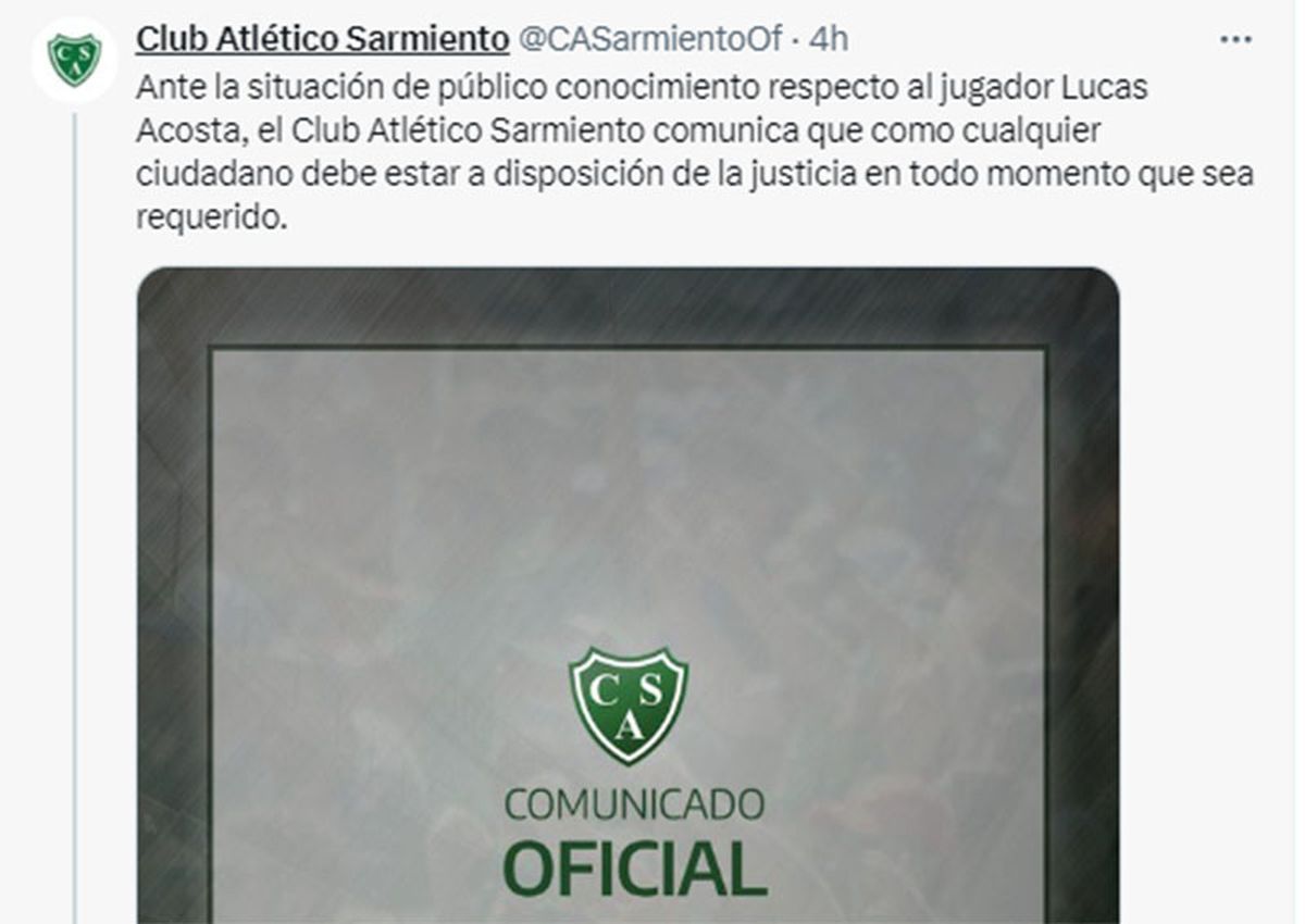 "Ante la situación de público conocimiento respecto al jugador Lucas Acosta, el Club Atlético Sarmiento comunica que como cualquier ciudadano debe estar a disposición de la justicia en todo momento que sea requerido", dijo el club verde.