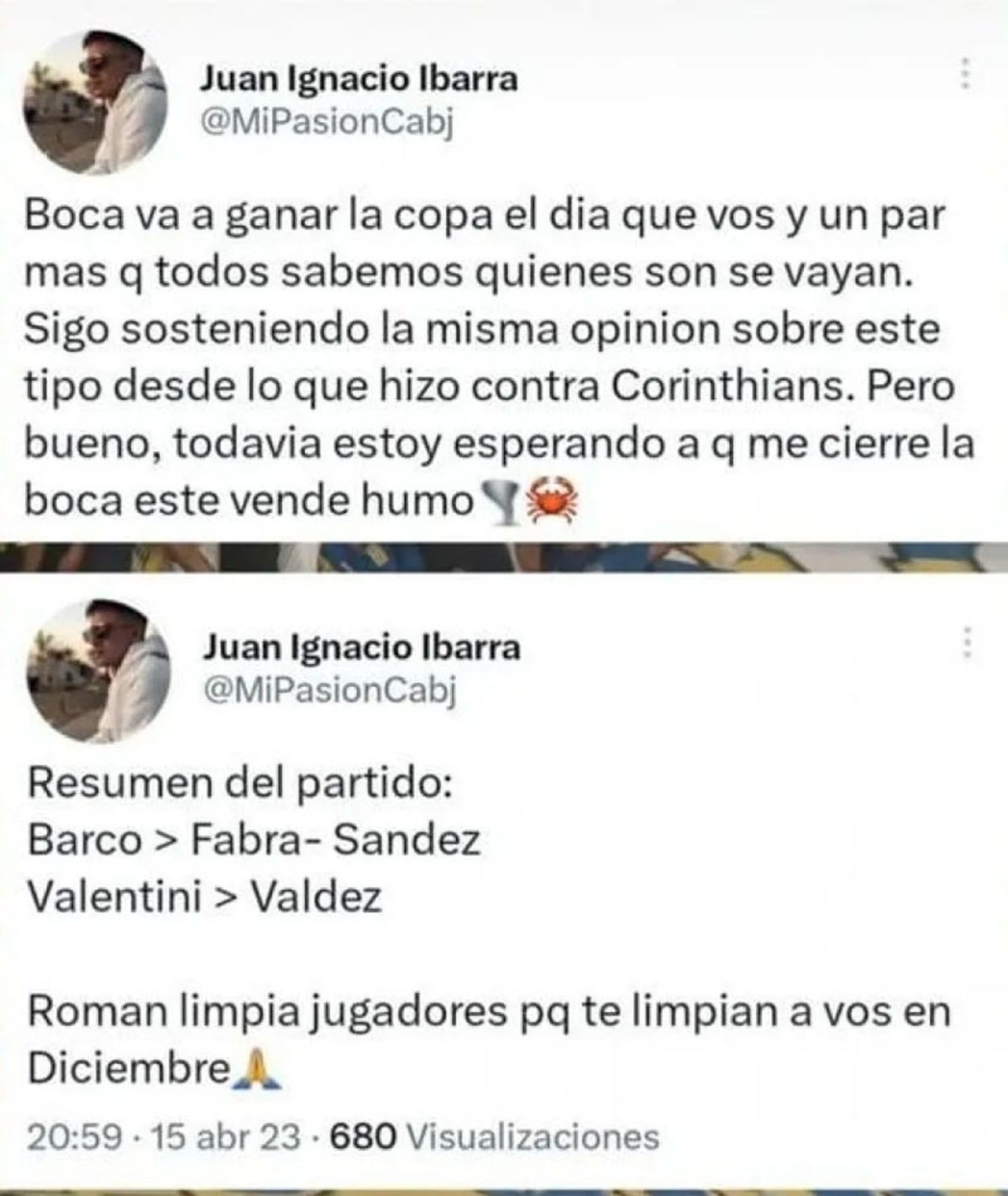 "Boca va a ganar la Copa el día que vos y un par más, que todos sabemos quiénes son, se vayan. Sigo sosteniendo la misma opinión sobre este tipo desde lo que hizo contra Corinthians. Pero bueno, todavía estoy esperando a que me cierre la boca este vende humo", disparó el joven.
