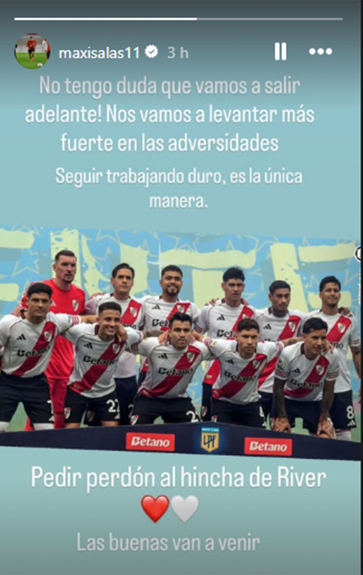 El delantero decidió mandarles un mensaje a los fanáticos de la institución de Núñez a través de sus redes sociales: “¡No tengo dudas de que vamos a salir adelante! Nos vamos a levantar más fuertes en las adversidades. Seguir trabajando duro, es la única manera. Pedir perdón al hincha de River, las buenas van a venir”.