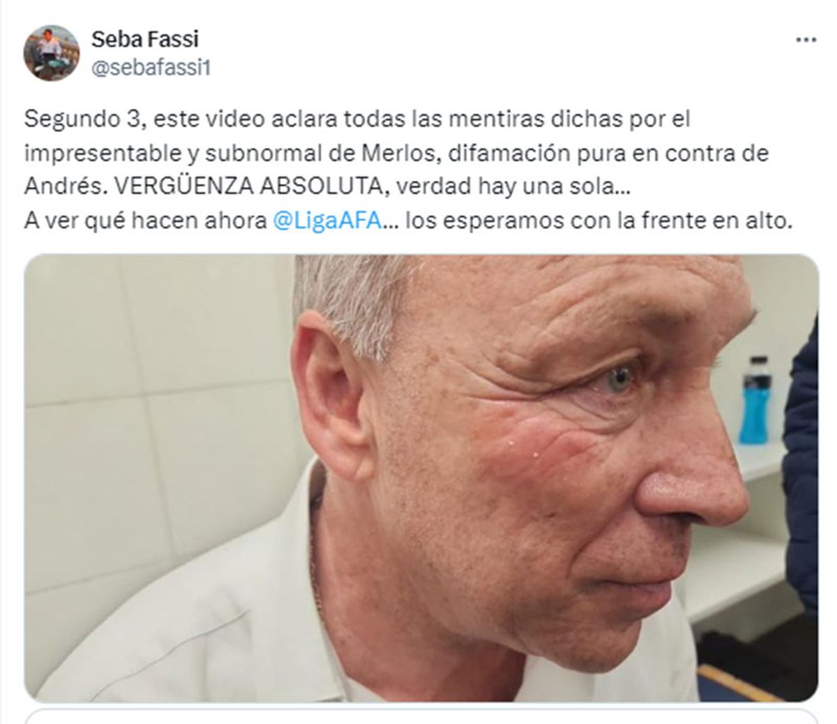 Apenas terminó la conferencia de prensa del presidente de Talleres, su hijo Sebastián Fassi publicó en sus redes sociales una foto del golpe a su padre.