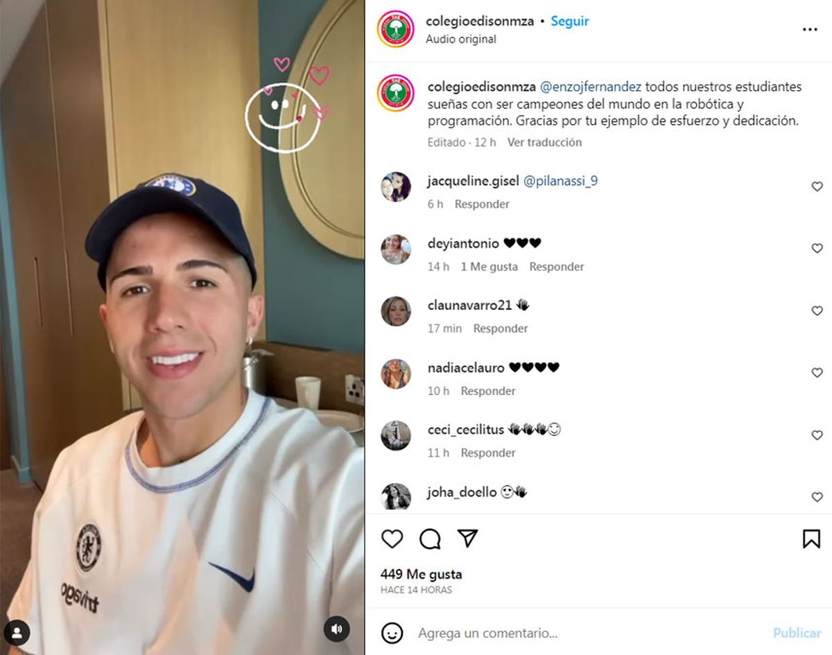 En la cuenta de Instagram de la institución, se puede apreciar un posteo, donde el flamante campeón del mundo sobresale con un mensaje: “Hola, soy Enzo, quería saludar al colegio Edison, a la promo EDS. Mandarles un saludo grande y espero que todos estén bien. Un beso”.